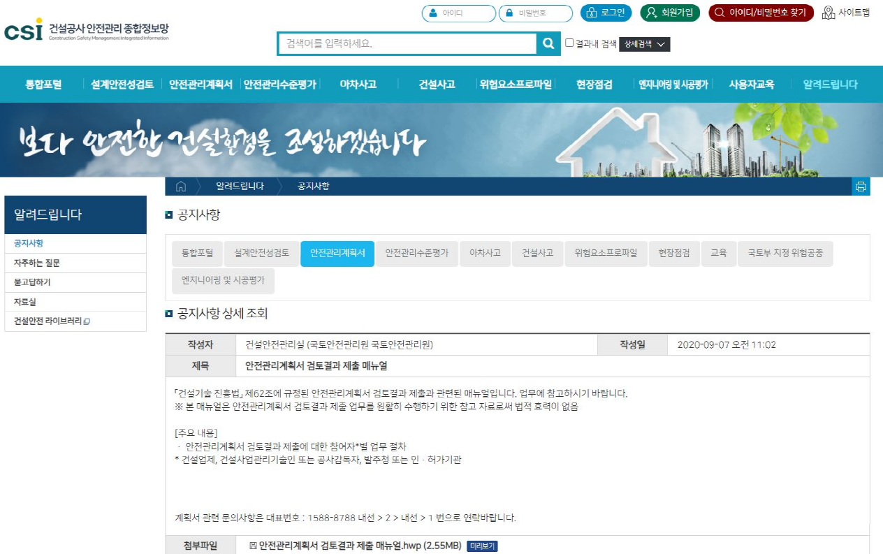 : 1,2종 시설물을 포함한 안전관리계획서는 발주기관 검토후 종합정보망(CSI)에 반드시 등록해야 합니다. (시공사)